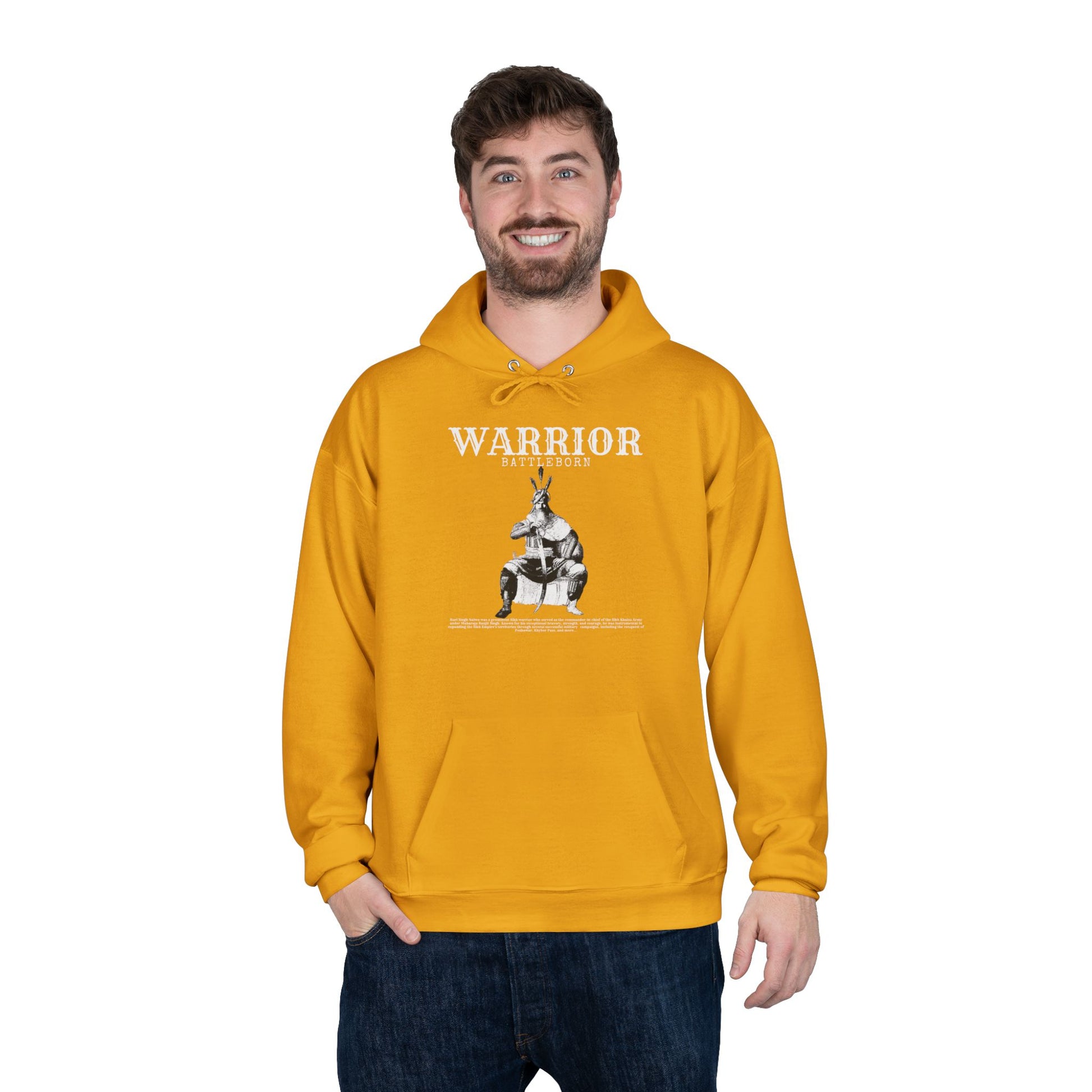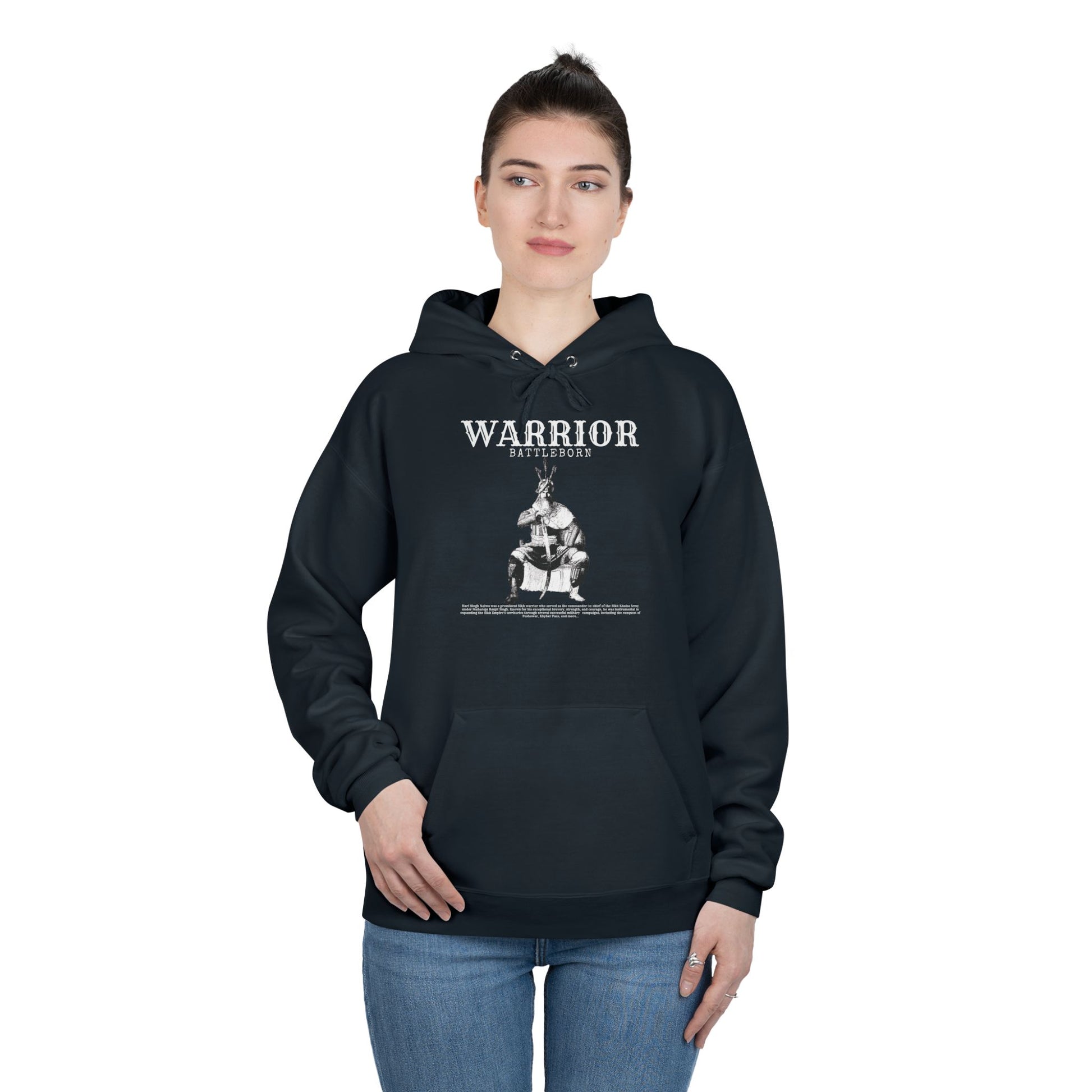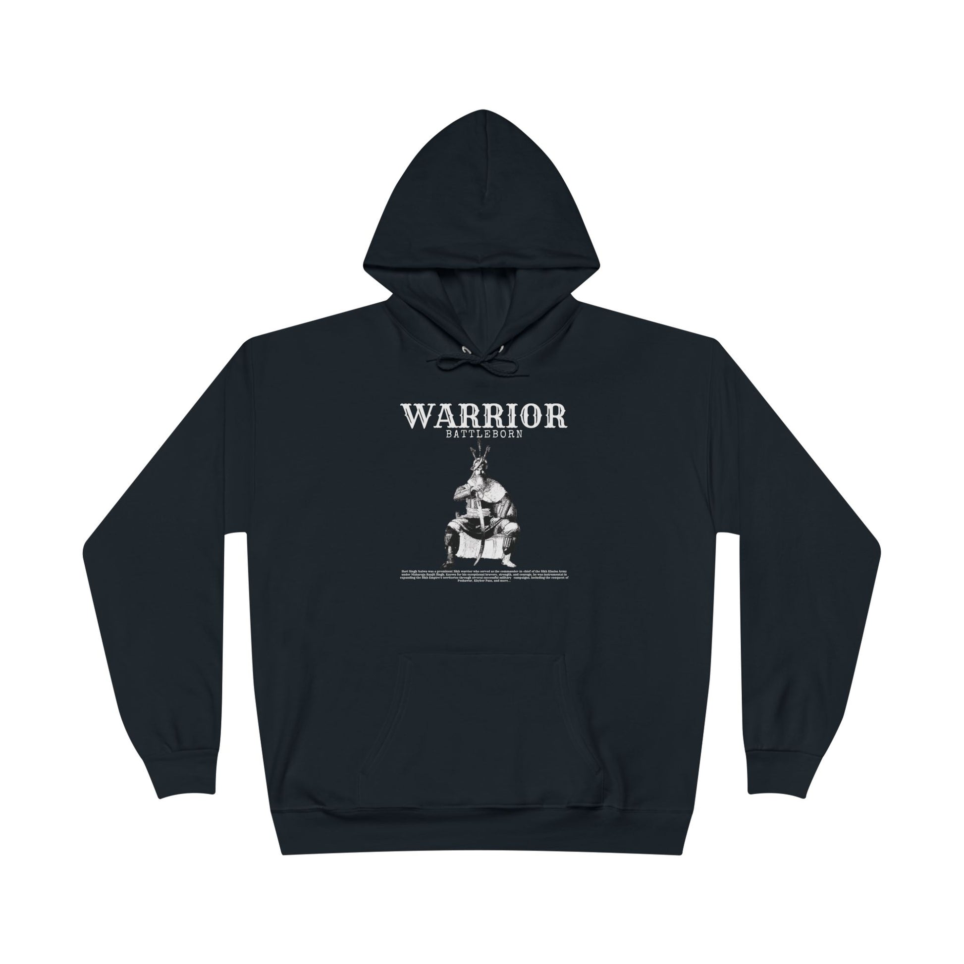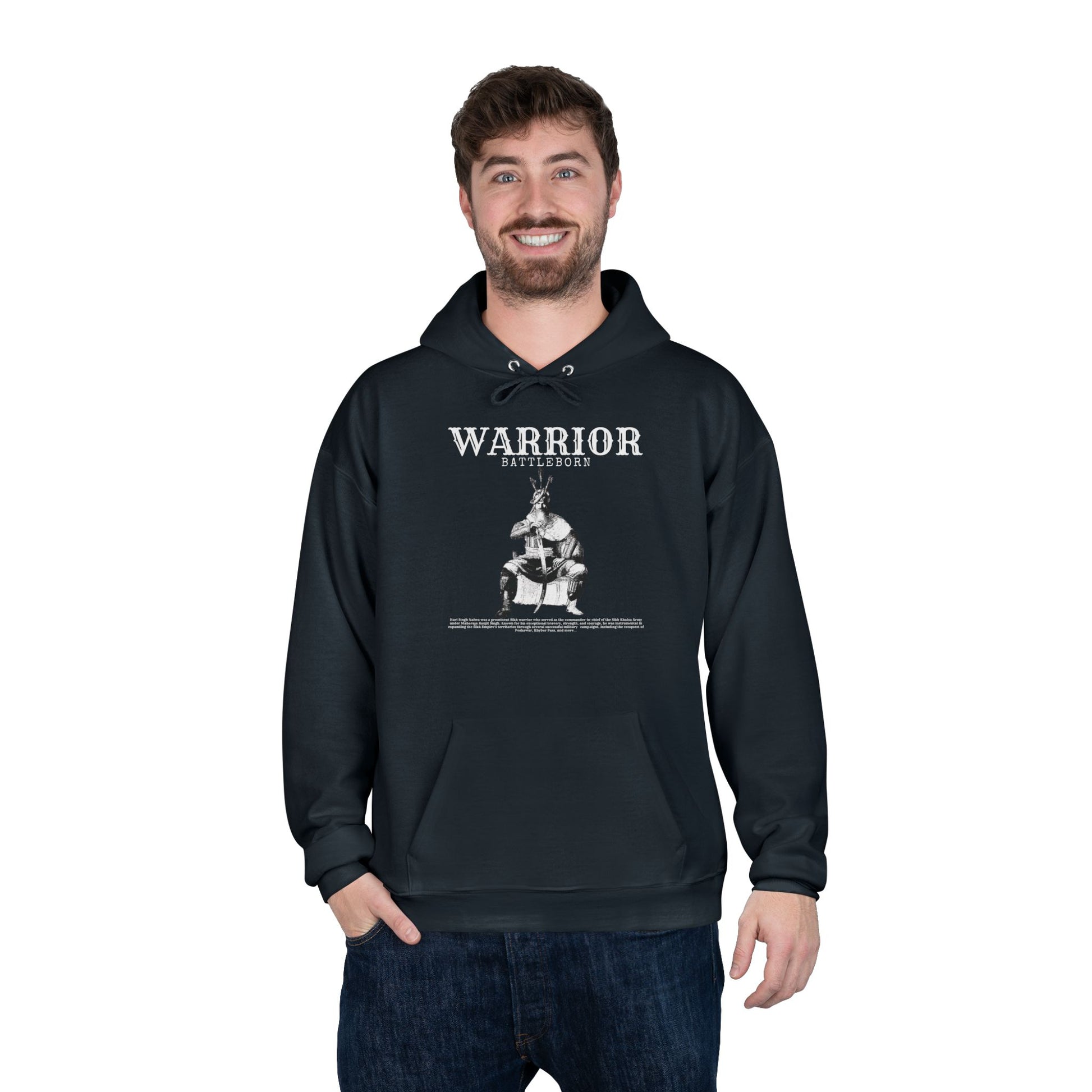 Honor the legendary Sikh warrior Hari Singh Nalwa with this bold and stylish hoodie. Known as the Commander-in-Chief of the Sikh Khalsa Army, Hari Singh Nalwa played a pivotal role in the expansion of the Sikh Empire under Maharaja Ranjit Singh. This hoodie symbolizes strength, bravery, and a rich cultural heritage. The Hanes ComfortBlend® EcoSmart® unisex pullover hoodie is a great pick for any store. This regular fit, medium-weight hoodie features a spacious pocket in the front. It is made of a patented, low-pill, high-stitch-density fleece that results in a soft, quality garment. This hoodie has no tag on the neck label and is made with up to 5% recycled polyester from plastic bottles. .: 50% cotton, 50% polyester (fiber content varies for different colors) .: Medium fabric (7.8 oz/yd² (264 g/m²)) .: Regular fit .: Fleece inside .: Tag-free neck label .: Made with up to 5% polyester created from recycled plastic bottles