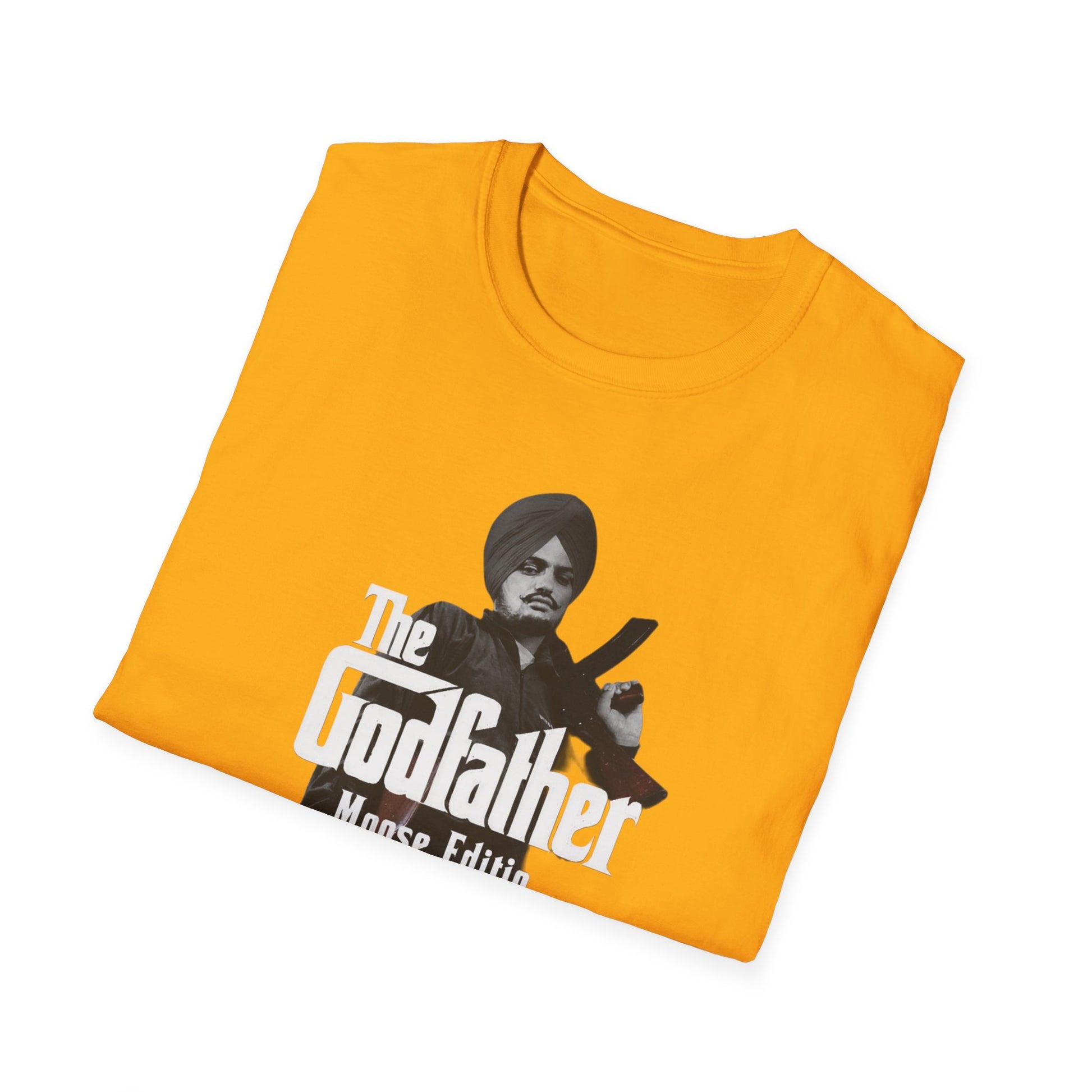 Pay homage to the legendary Punjabi singer and cultural icon, Sidhu Moosewala, with this unique 'Godfather Moose Edition' T-shirt. Featuring a bold graphic design inspired by his fearless persona and musical legacy, this T-shirt is a must-have for fans of Moosewala and Punjabi culture. The unisex soft-style t-shirt puts a new spin on casual comfort. Made from very soft materials, this tee is 100% cotton for solid colors. Heather colors and sports grey include polyester. The shoulders have twill tape for improved durability. There are no side seams. The collar is made with ribbed knitting to prevent curling damage. .: Made with 100% ring-spun cotton, a lightweight fabric (4.5 oz/yd² (153 g/m²)), this unisex t-shirt feels like a bliss to wear all year round. .: The classic fit with the crew neckline deliver a clean, versatile style that can match any occasion, whether it's formal or semi-formal. .: All shirts feature a pearlized, tear-away label for total wearing comfort. .: Made using ethically grown and harvested US cotton. Gildan is also a proud member of the US Cotton Trust Protocol ensuring ethical and sustainable means of production. This blank tee is certified by Oeko-Tex for safety and quality assurance. .: Fabric blends: Heather colors - 35% ring-spun cotton, 65% polyester; Sport Grey and Antique colors - 90% cotton, 10% polyester, Graphite Heather - 50% ring-spun cotton, 50% polyester